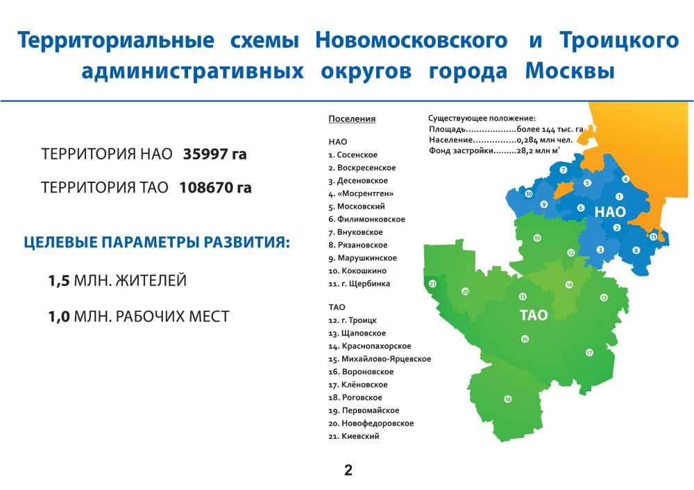 Реформа муниципальных округов 2012-го добавила ТАО в состав Москвы. Раннее данные земли были в составе Московской области. Является самым крупным по площади округом Москвы в 1000 квадратных километров и население 130000 человек. Вы можете рассмотреть ТАО для жизни в Москве как экономичный и экологичный вариант. Так как округ плотно окружен полями и лесами, промышленных объектов мало, а также много озер и рек. Минусов является отдалённость округа от центра. При этом количество вакансий стремительно растёт, строятся новые ЖК, открываются школьные комплексы. Средняя зарплата в ТАО составляет 55000 рублей. Количество рабочих мест в ближайшее время может вырасти до 1 миллиона, поэтому округ становится всё более востребованным у мигрантов, в основном растёт сфера услуг, хотя и планируется открытие промышленных объектов в скором времени. Переезд сюда всё больше становится перспективным.